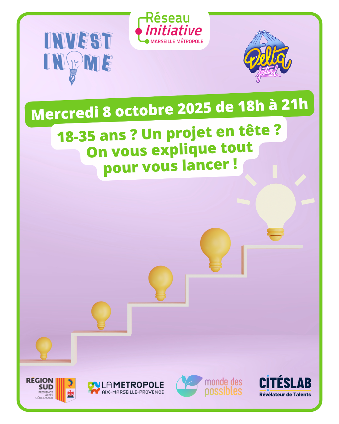 Initiative Marseille Métropole t'invite à un atelier dédié aux porteurs de projet, en partenariat avec Invest in Me, un programme d'animation et de sensibilisation à l'entrepreneuriat porté par Le Monde des Possibles et le Delta Festival.